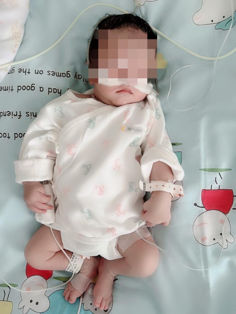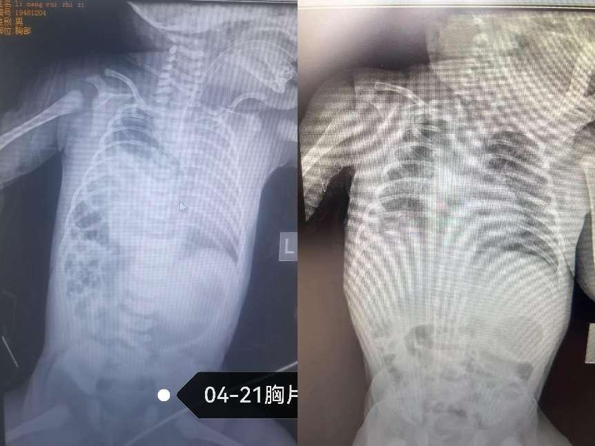 然而,命运似乎给这个家庭开了一个残酷的玩笑。孩子在曲靖第一人民医院顺产后,由于肝脏及肠管疝入右侧胸腔,右肺受到严重压迫且发育不良,出生后不久就出现了青紫和呼吸困难的症状。尽管产院立即给予了呼吸机辅助通气治疗,但症状并未得到缓解。在生后的7小时余,睿睿被紧急转入我院,入院后立即采取了高频呼吸机辅助通气、一氧化氮吸入等治疗措施。