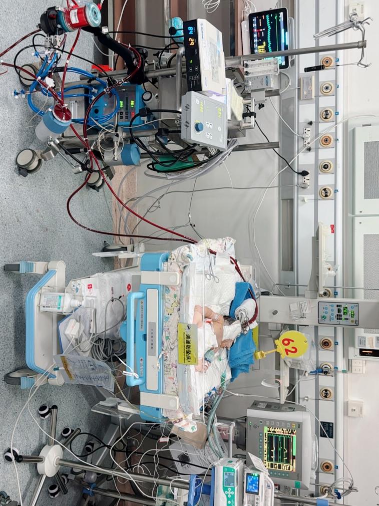 面对重症膈疝带来的巨大挑战,尽管我们全力以赴,由于重症膈疝,睿睿的呼吸困难症状并未得到改善,肺动脉压持续增高,心功能进一步恶化。在这种情况下,睿睿的生命岌岌可危,不得不面临紧急手术。新生儿科联合心胸外科、PICU、心脏超声科等多学科团队紧急会诊后,决定立即给予ECMO体外生命支持治疗,为实施紧急手术治疗创造条件。