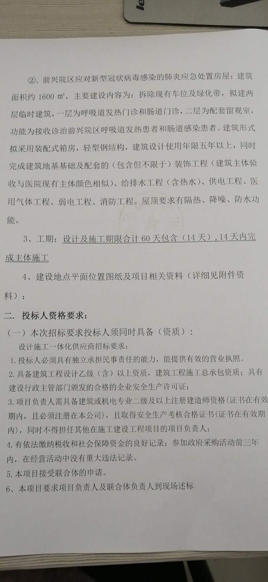 ②.前兴院区应对新型冠状病毒感染的肺炎应急处置房屋:建筑面积约1600㎡,主要建设内容为:拆除现有车位及绿化带,拟建两层临时建筑,一层为呼吸道发热门诊和肠道门诊,二层为配套留观室,功能为接收诊治前兴院区呼吸道发热患者和肠道感染患者。建筑形式拟采用装配式箱房,轻型钢结构,建筑设计使用年限五年以上,同时完成建筑地基基础及配套的(包含但不限于)装饰工程(建筑主体验收与医院现有主体颜色相似)、给排水工程(含热水)、供电工程、医用气体工程、弱电工程、消防工程。屋顶要求有隔热、降噪、防水功能。