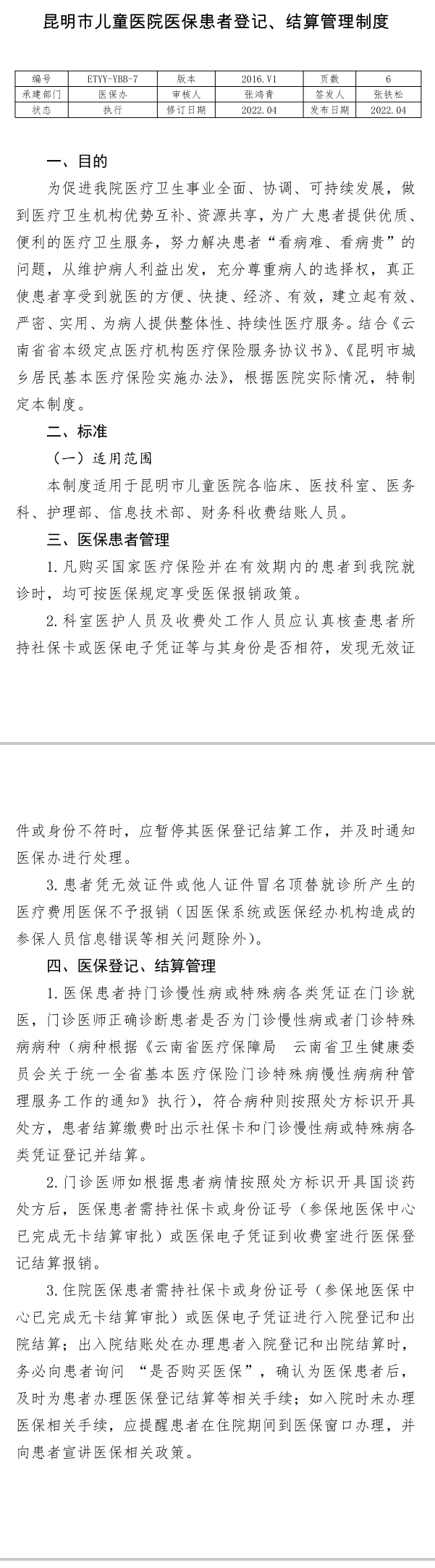 昆明巿儿童医院医保患者登记、结算管理制度